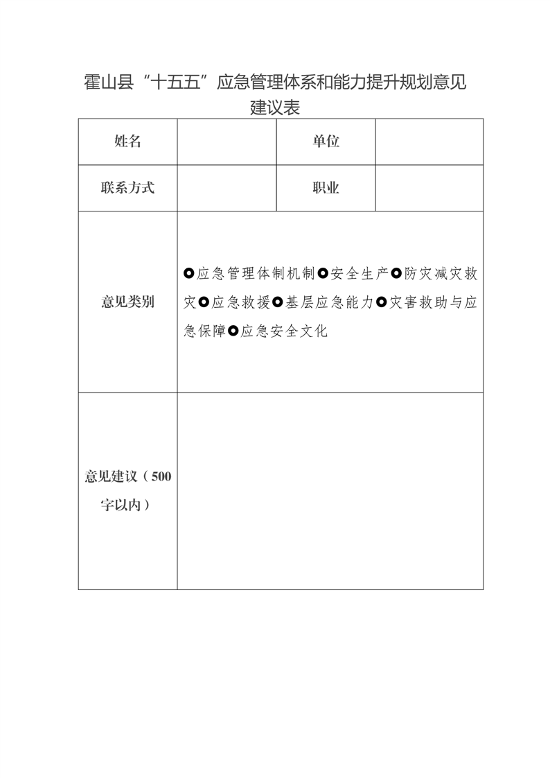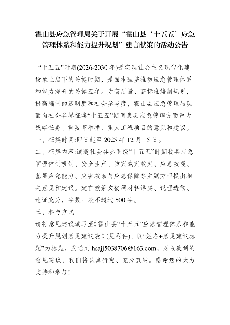 霍山县应急管理局关于开展“霍山县‘十五五’应急管理体系和能力提升规划”建言献策的活动公告.doc