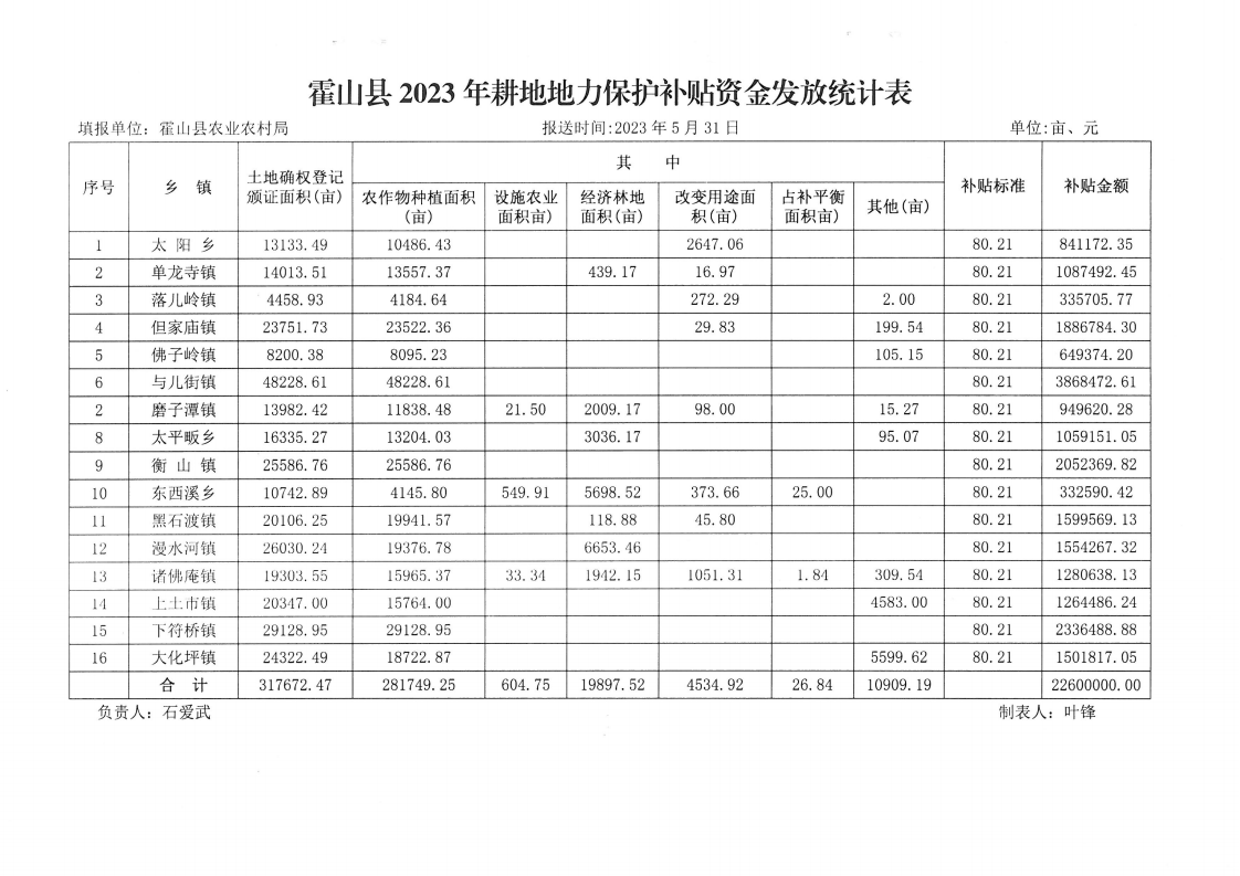 【分配结果】霍山县2023年耕地地力保护补贴资金发放