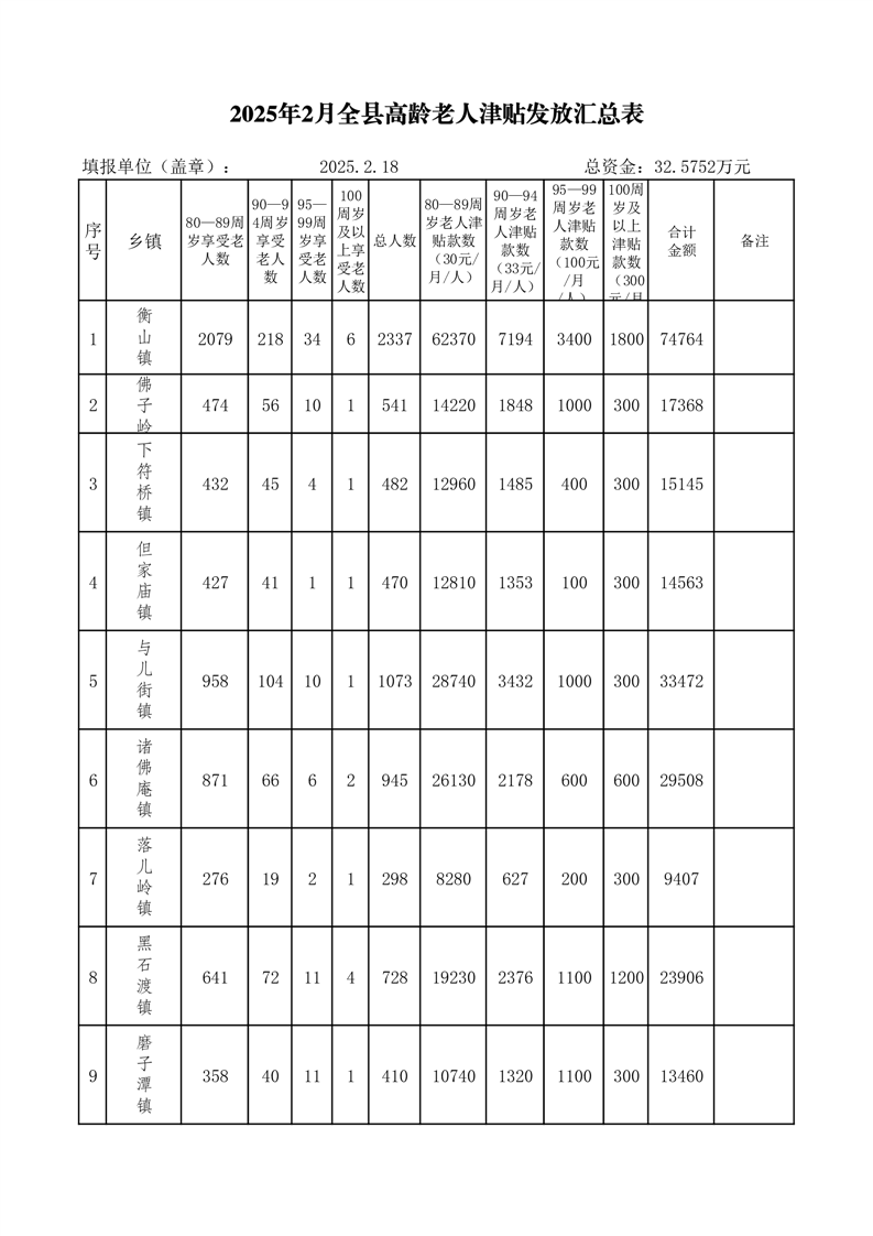 老年人补贴申领和发放结果(2025年2月份高龄津贴汇总表)