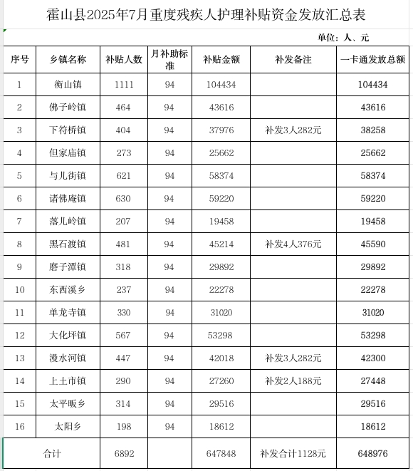 霍山县2025年7月县本级重度残疾人护理补贴发放汇总表