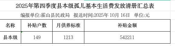 2025年第四季度县本级孤儿基本生活费发放清册汇总表