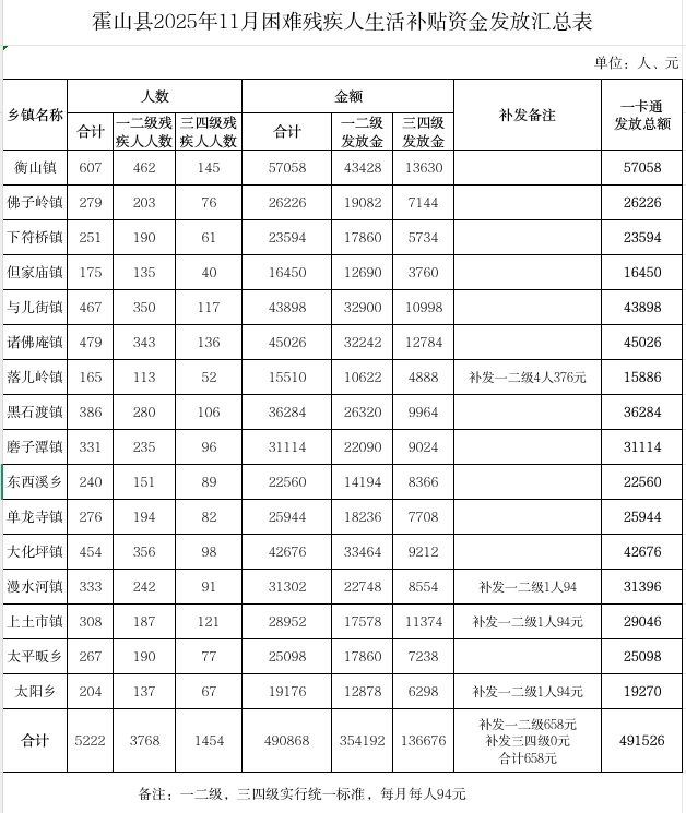 霍山县2025年11月困难残疾人生活补贴资金发放汇总表