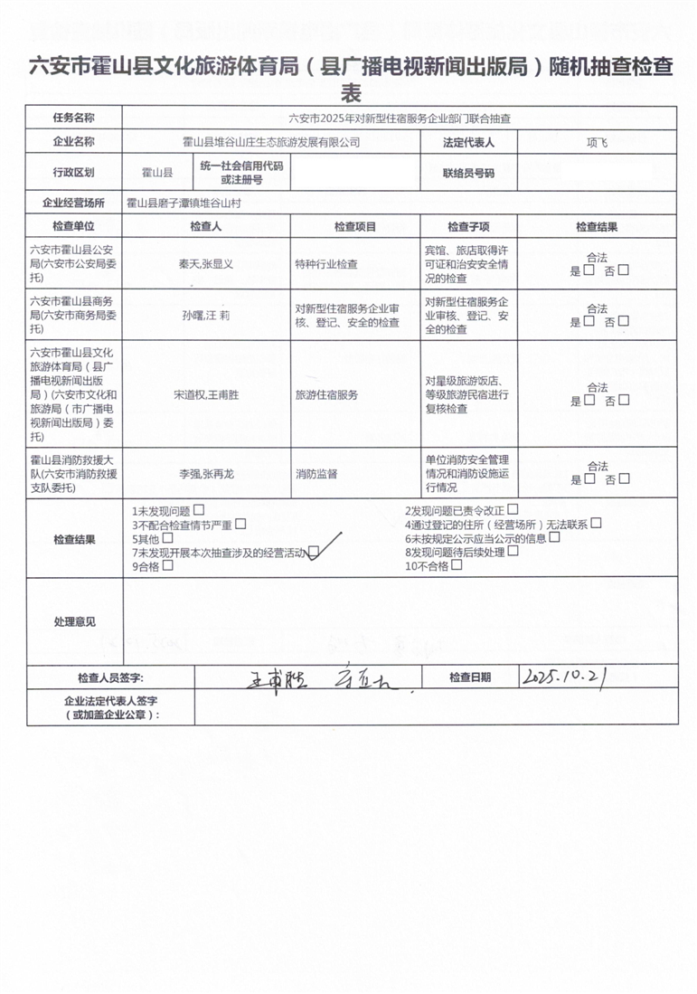 六安市2025年对新型住宿服务企业部门联合抽查——霍山县堆谷山庄生态旅游发展有限公司