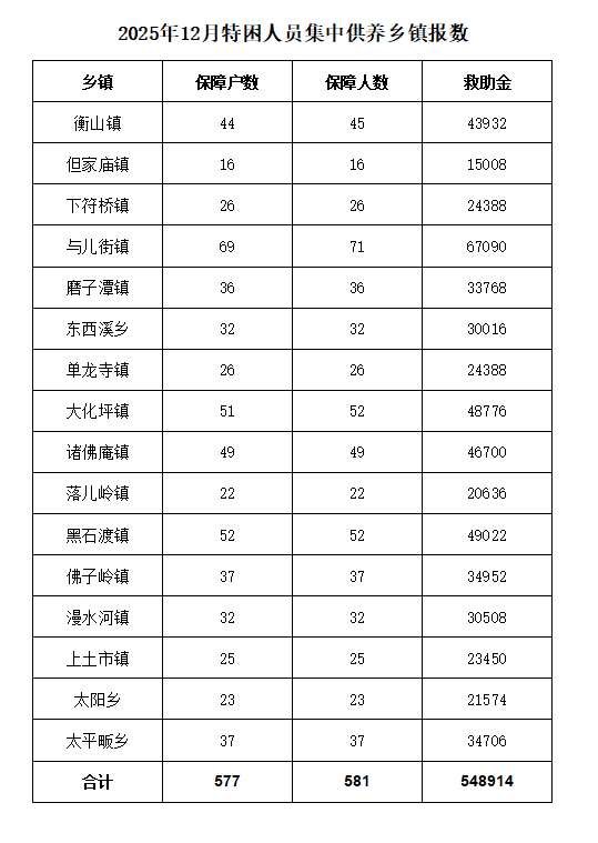 霍山县民政局2025年12月城乡特困人员救助供养拨款统计表