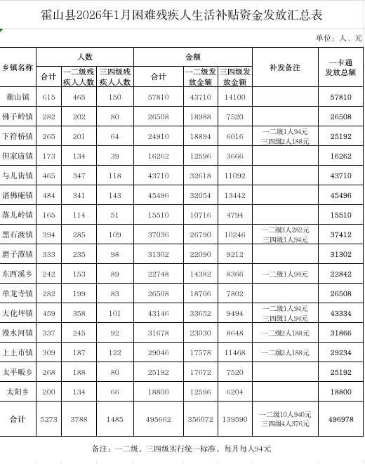霍山县2026年1月困难残疾人生活补贴资金发放汇总表