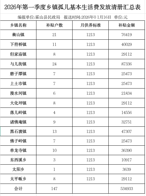 2026年第一季度乡镇孤儿基本生活费发放清册汇总表