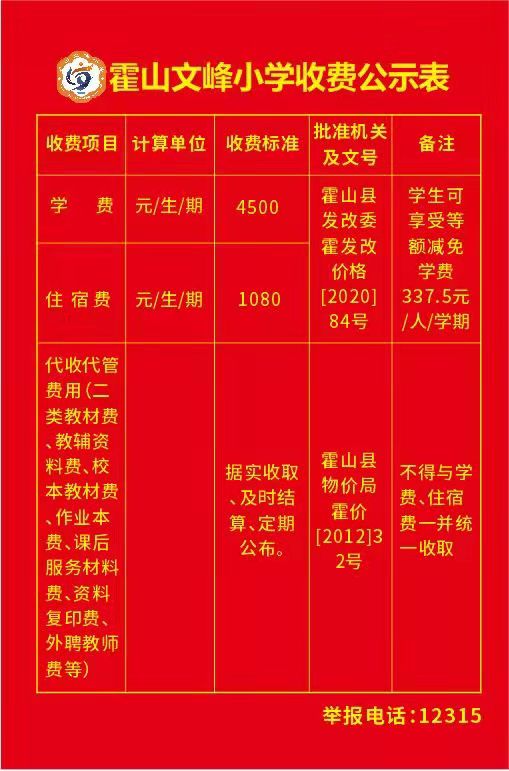 霍山文峰小学收费公示表