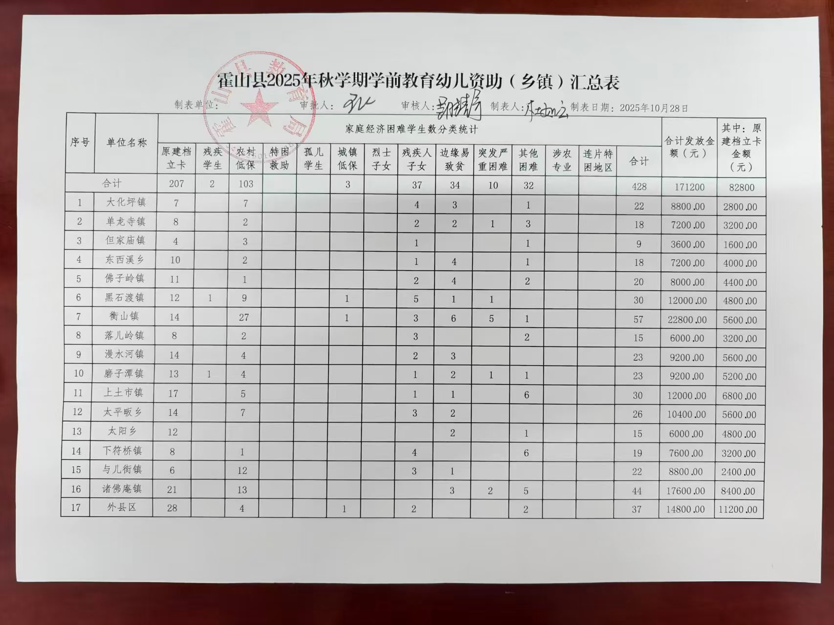 霍山县2025年秋学期学前教育幼儿资助(乡镇)汇总表