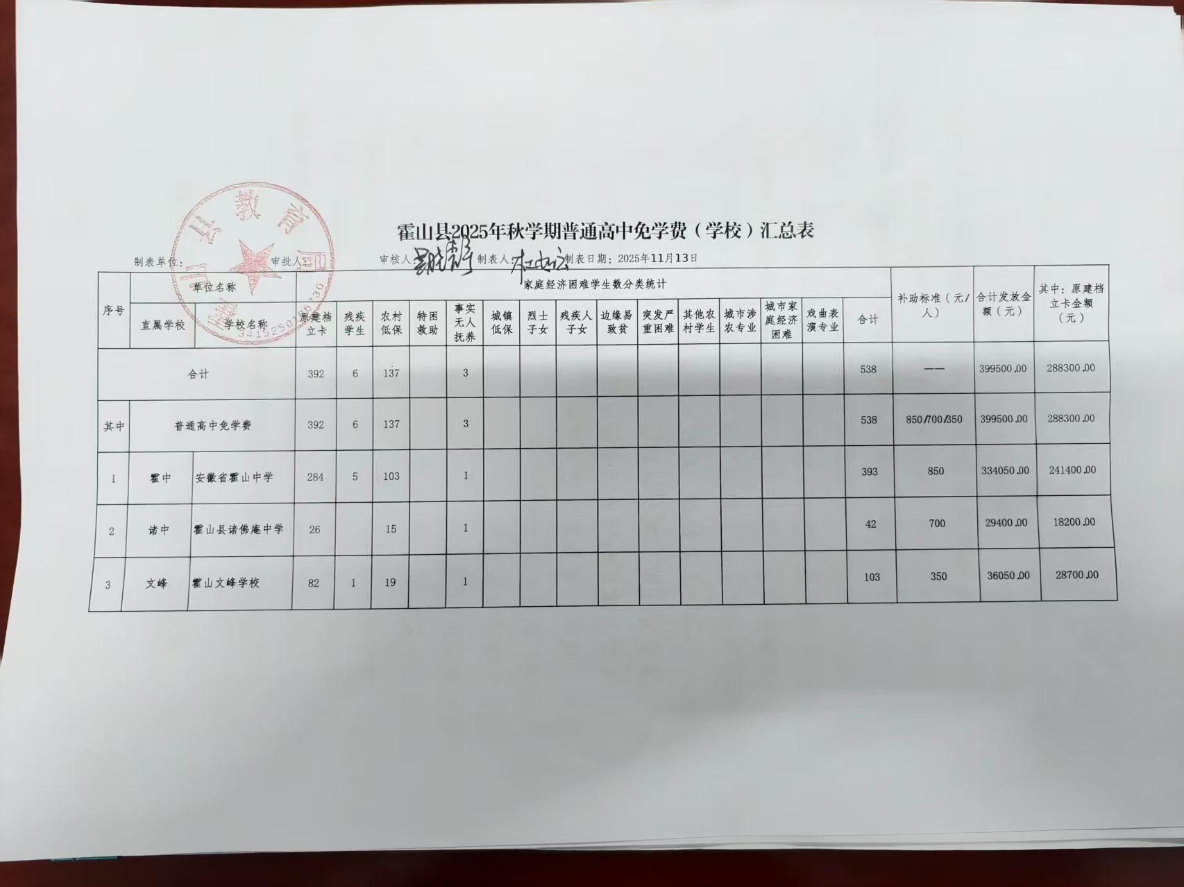 霍山县2025年秋学期普通高中免学费(学校)汇总表