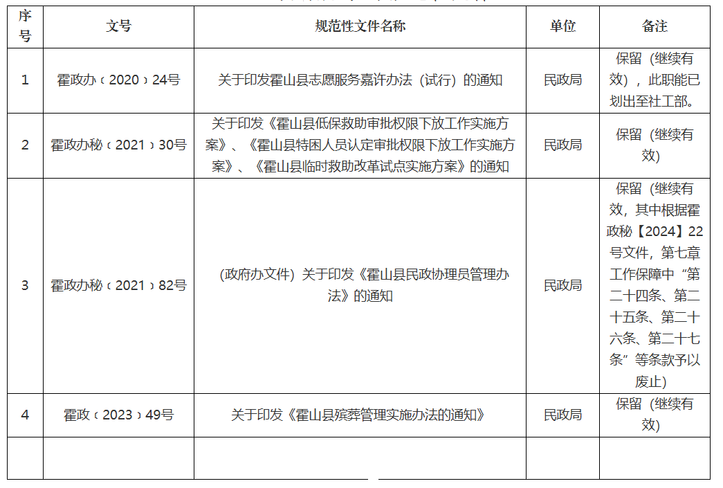 2025年截至目前,霍山县民政局未发布新的规范性文件,待发布后及时更新,特此说明。我局现行有效规范性文件目录如下: