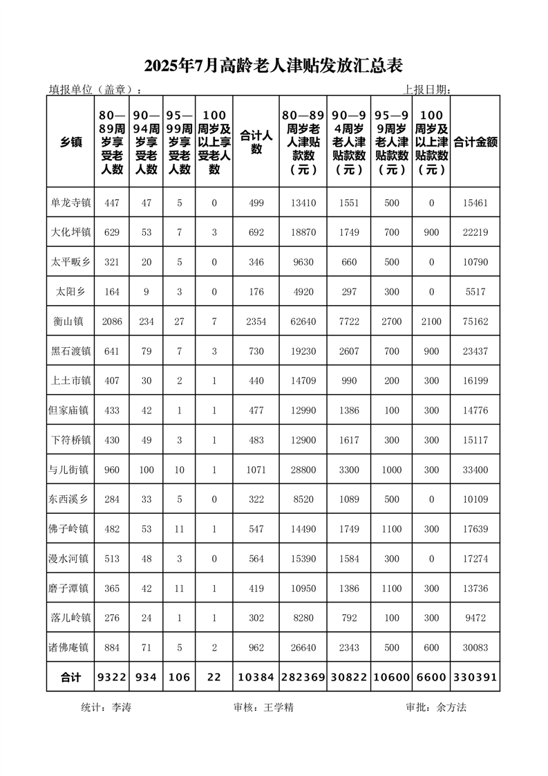 老年人补贴申领和发放结果(2025年7月份高龄津贴汇总表)