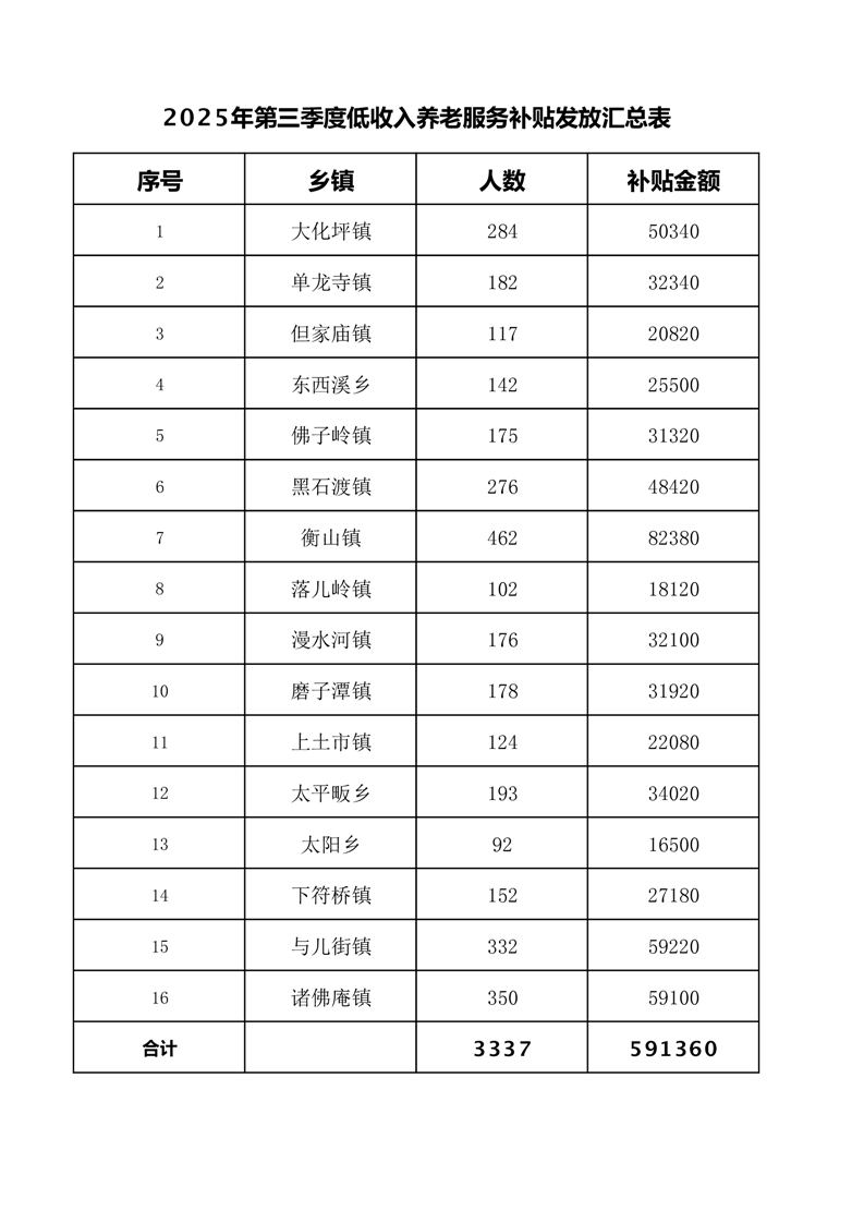 老年人补贴申领和发放结果(2025年第三季度低收入养老服务补贴发放汇总表)