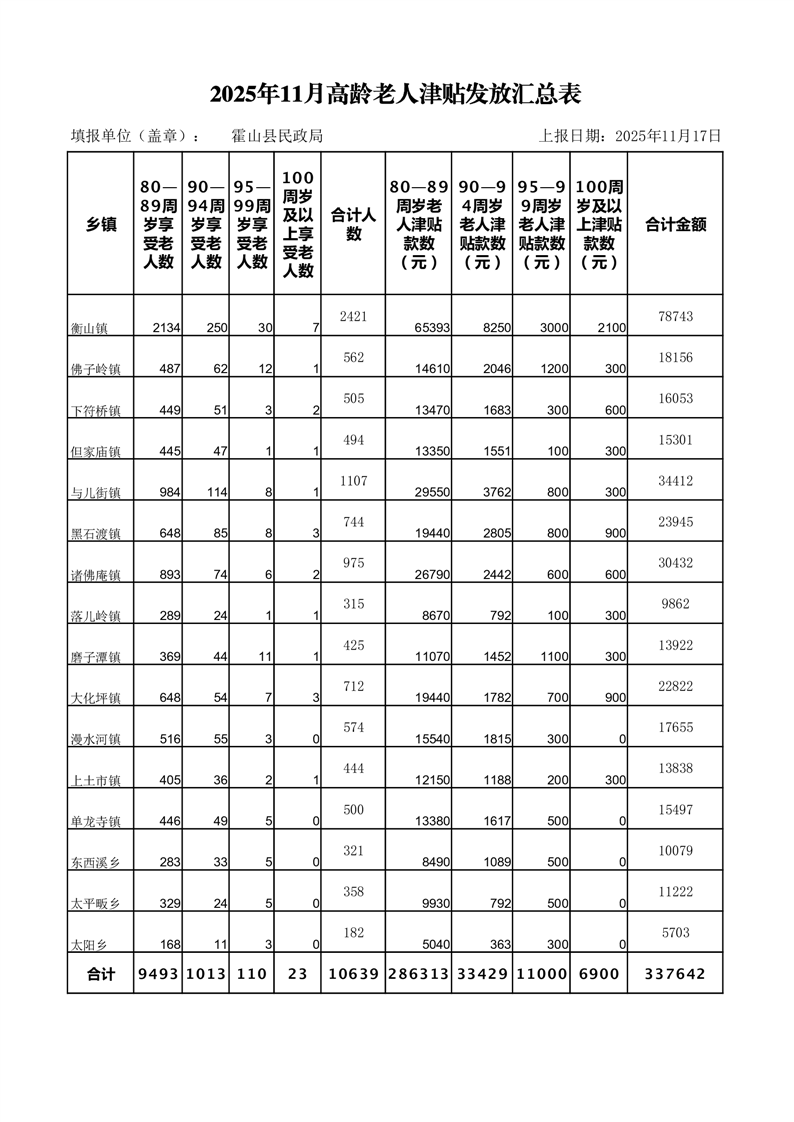 老年人补贴申领和发放结果(2025年11月份高龄津贴汇总表)