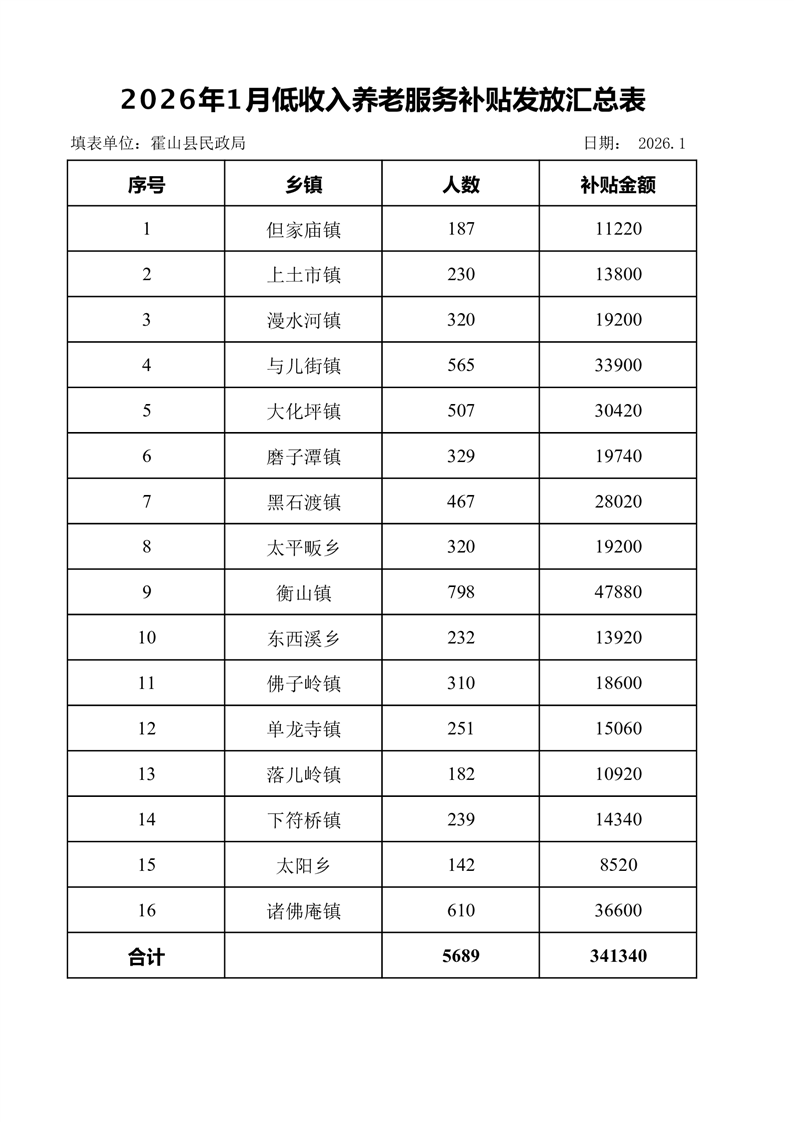 老年人补贴申领和发放结果(2026年1月低收入养老服务补贴发放汇总表)