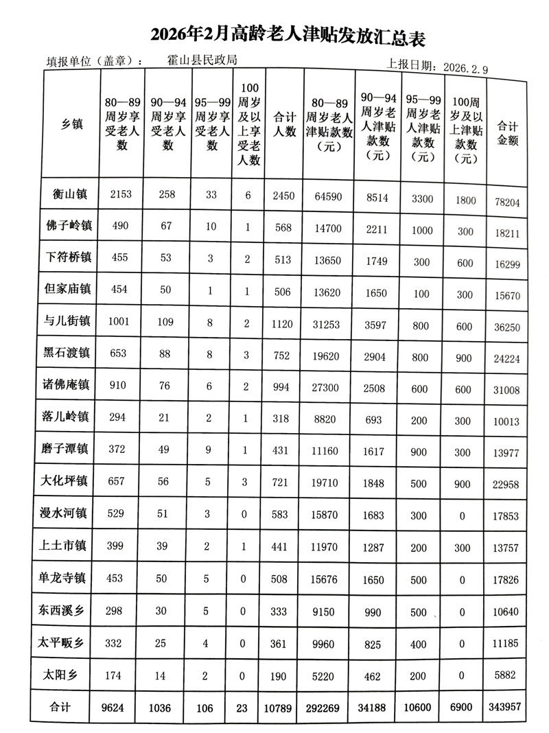 老年人补贴申领和发放结果(2026年2月份高龄津贴汇总表)