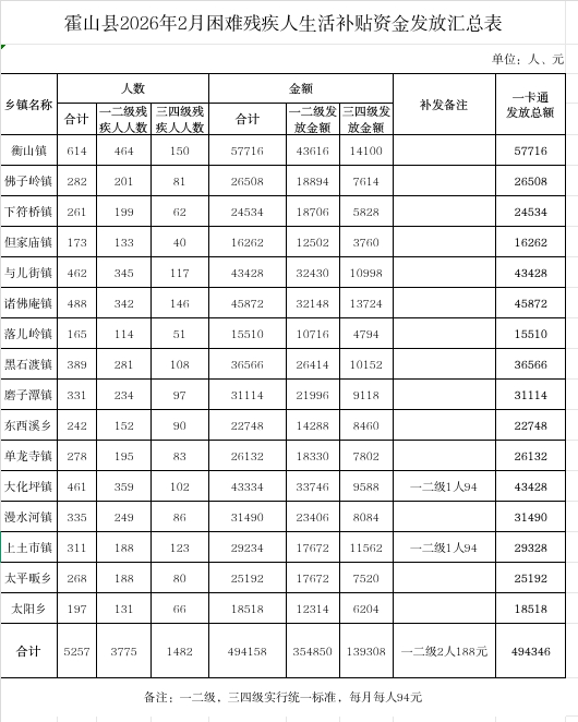 霍山县民政局2026年主动回应——2月困难残疾人生活补贴资金发放汇总表
