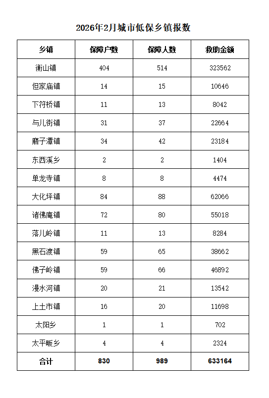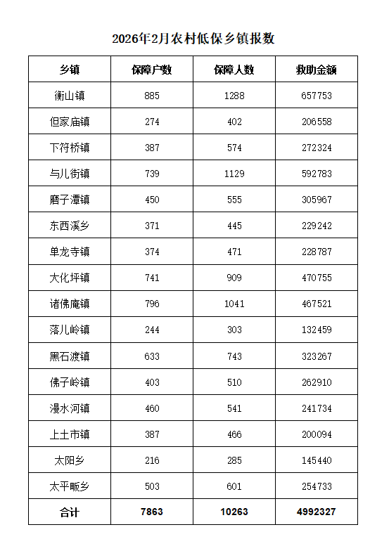 霍山县民政局2026年主动回应——2月城乡低保拨款统计表
