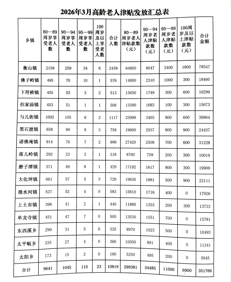 老年人补贴申领和发放结果(2026年3月份高龄津贴汇总表)