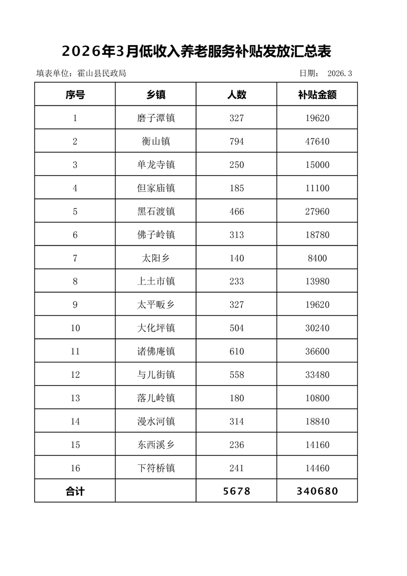 老年人补贴申领和发放结果(2026年3月低收入养老服务补贴发放汇总表)