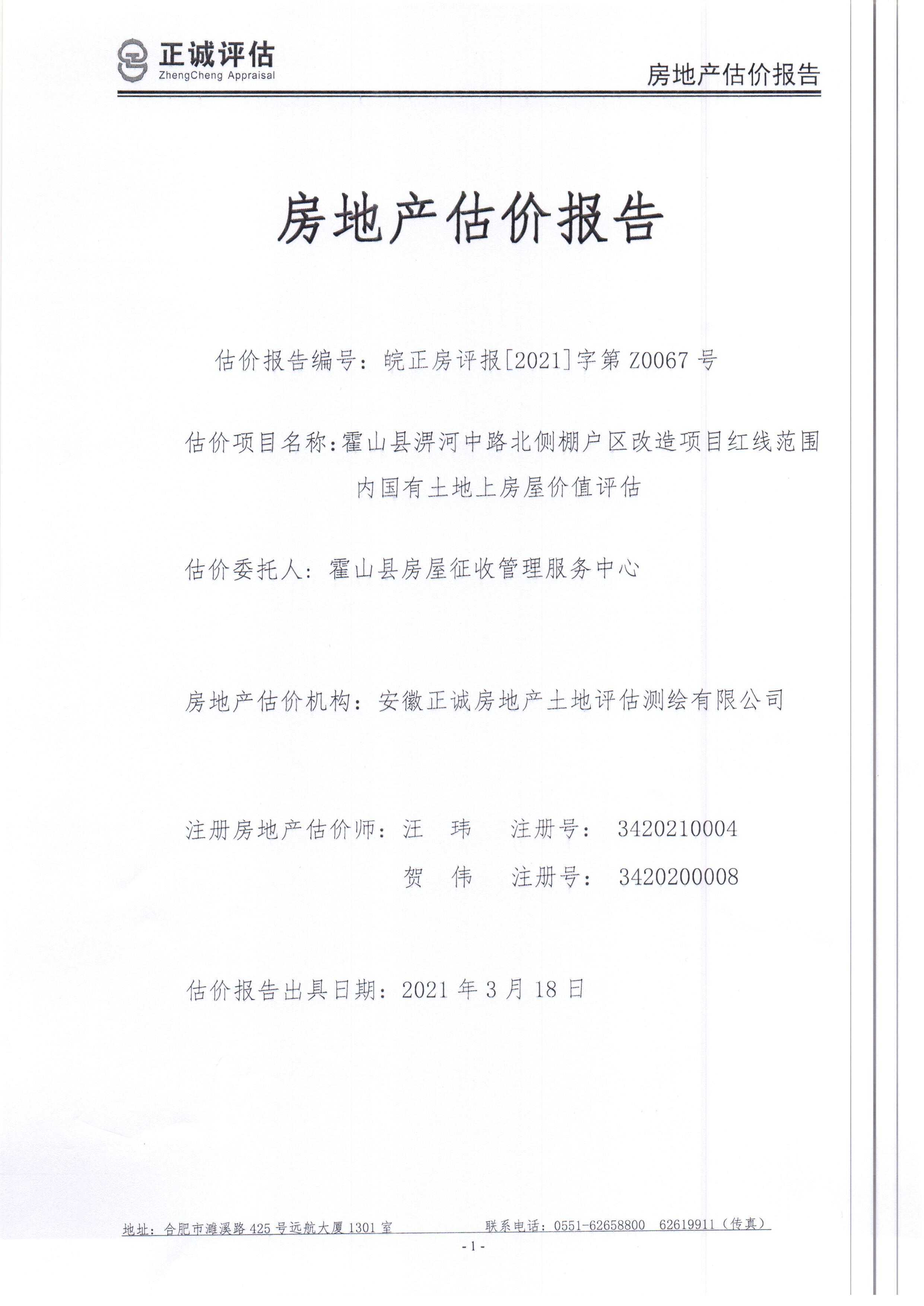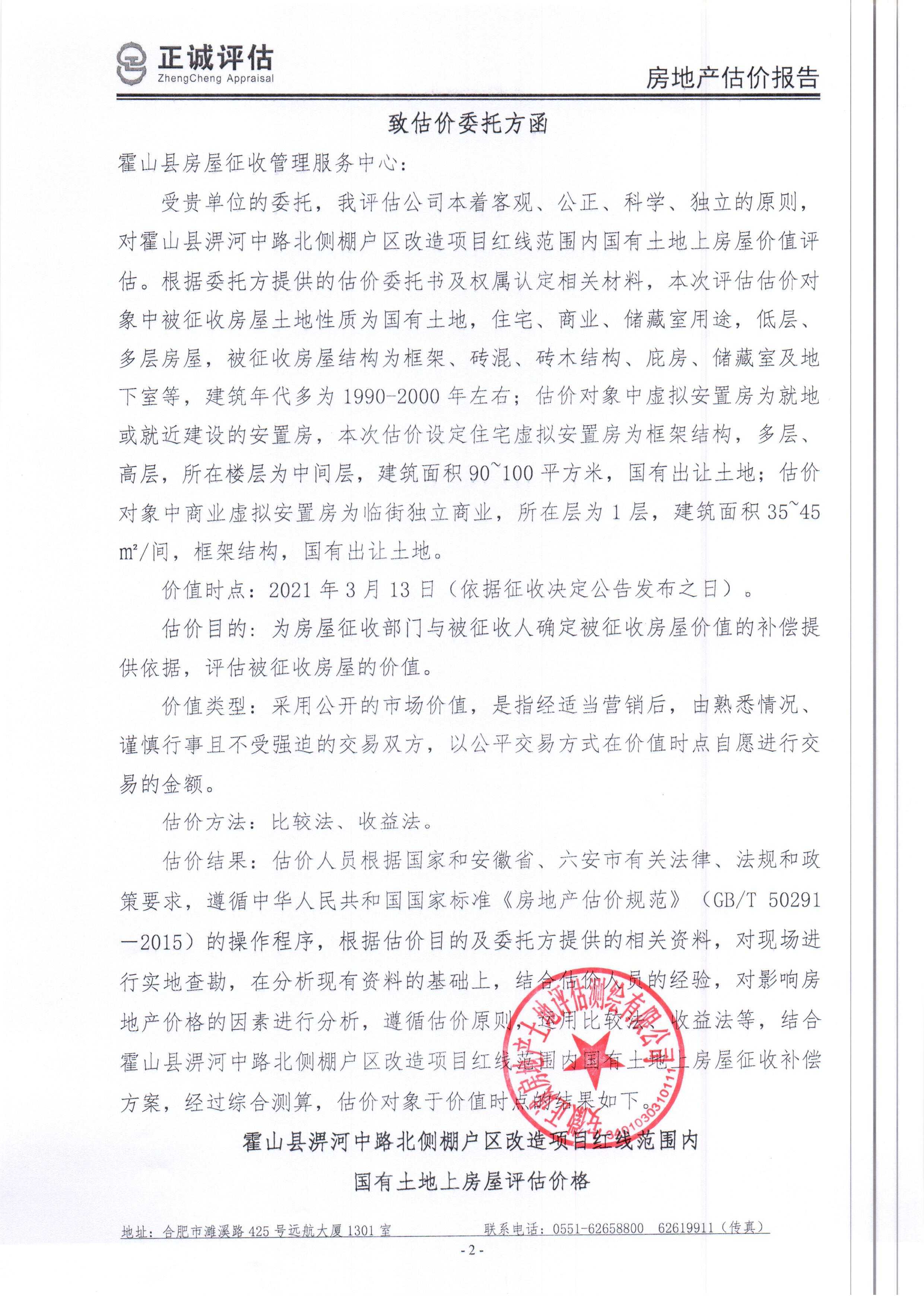 霍山县淠河中路北侧棚改地块红线范围内国有土地上房屋征收评估报告