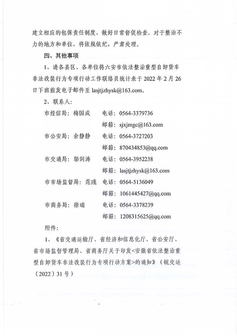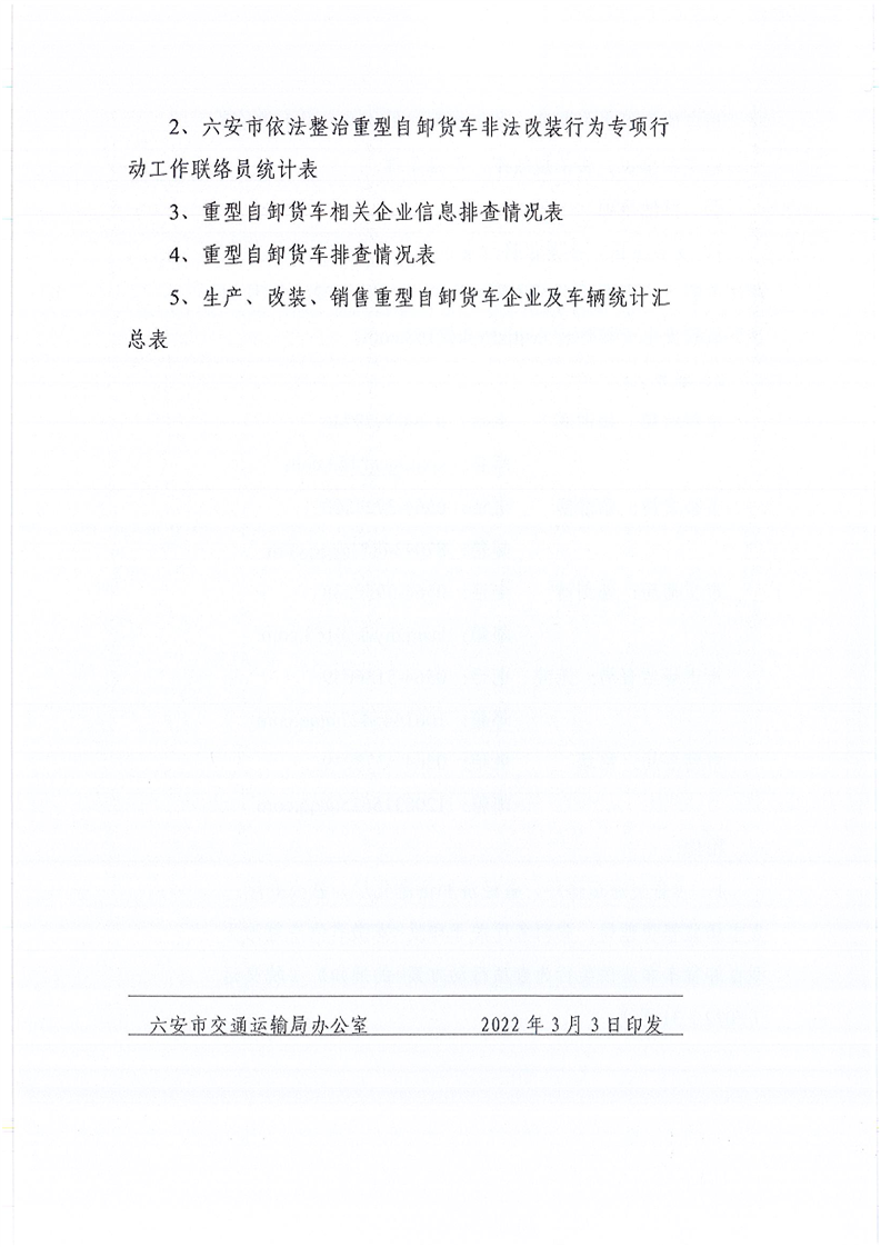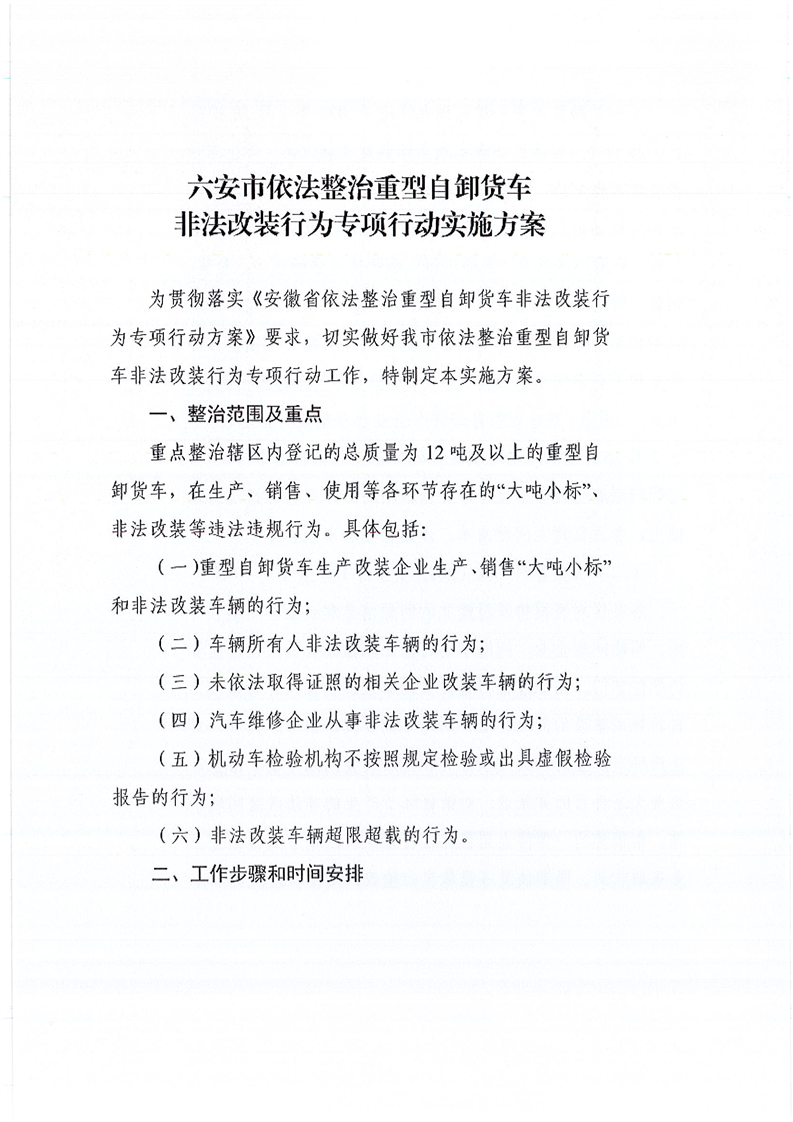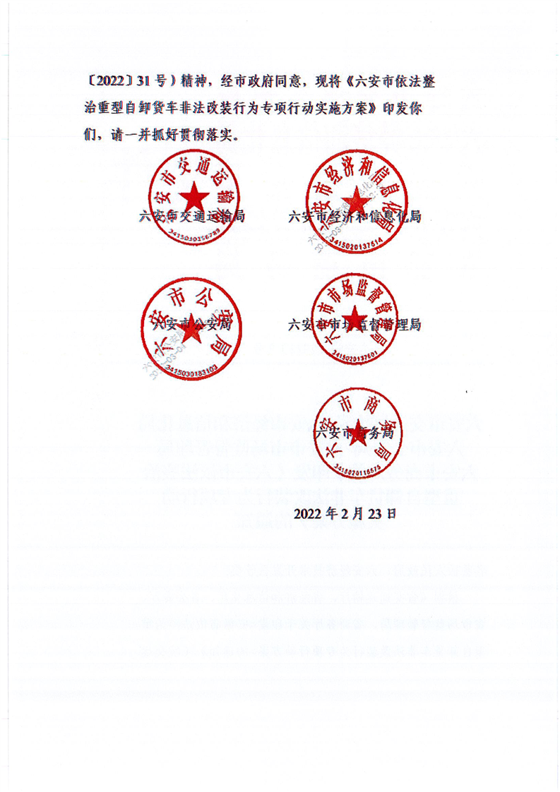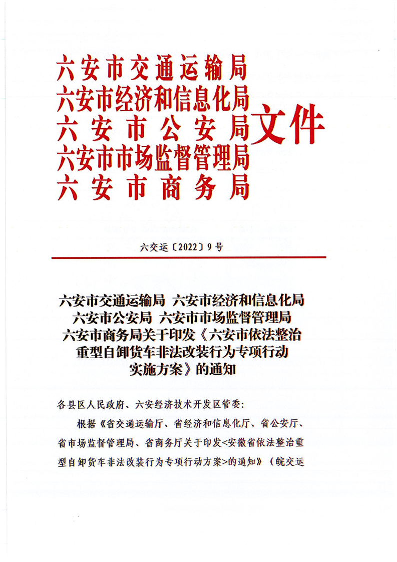 【政策文件】六安市交通运输局六安市经济和信息化局六安市公安局六安市市场监督管理局六安市商务局关于印发《六安市依法整治重型自卸货车非法改装行为专项行动实施方案》的通知