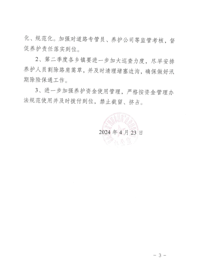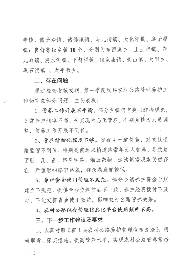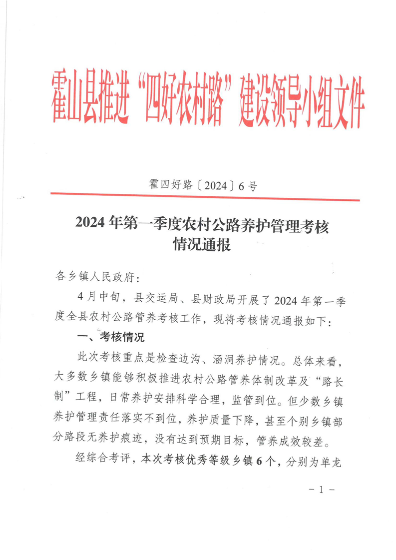 2024年第一季度农村公路养护管理考核情况通报