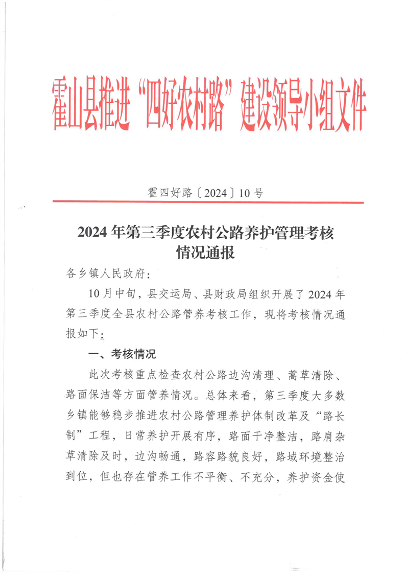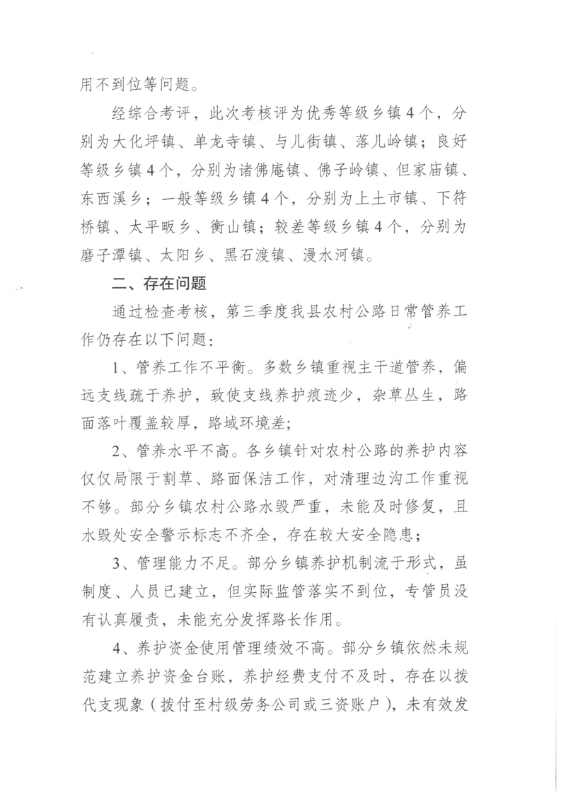 2024年第三季度农村公路养护管理考核情况通报
