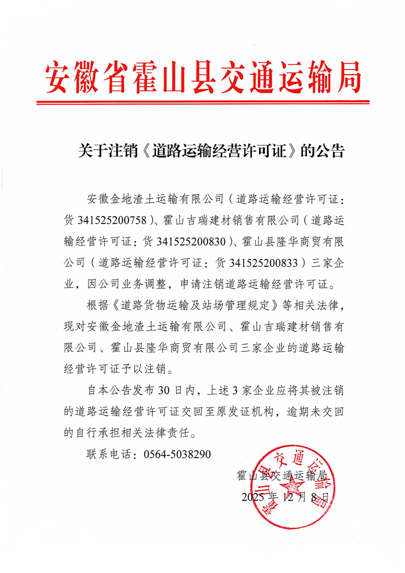 关于注销《道路运输经营许可证》的公告