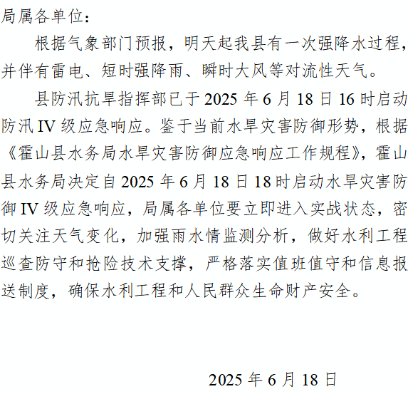 回应——关于启动霍山县水务局水旱灾害防御Ⅳ级应急响应的通知