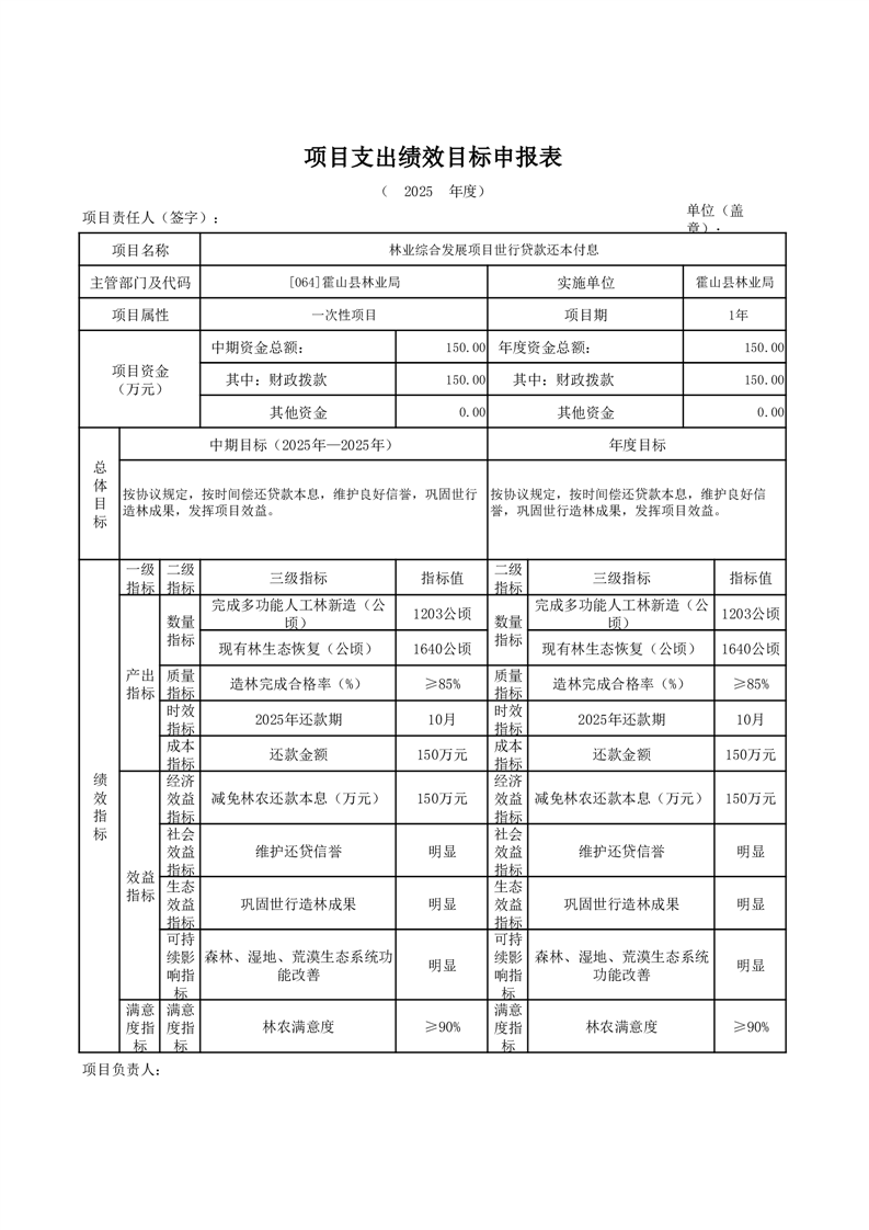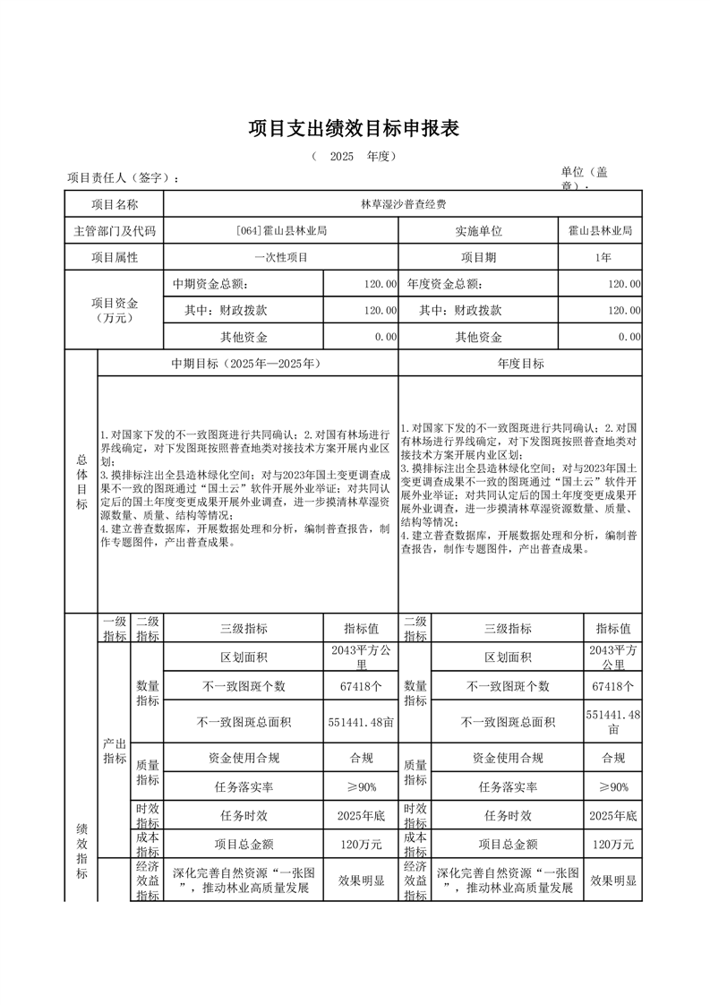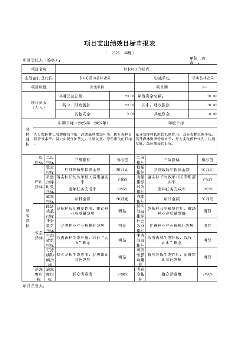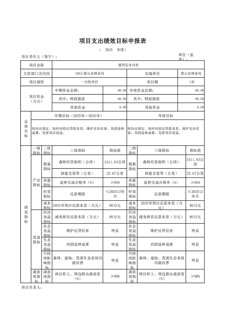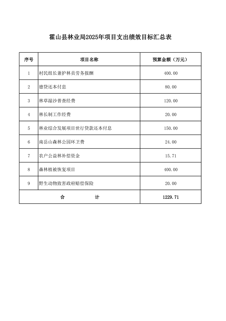 霍山县林业局2025年部门项目支出预算安排情况及绩效目标表