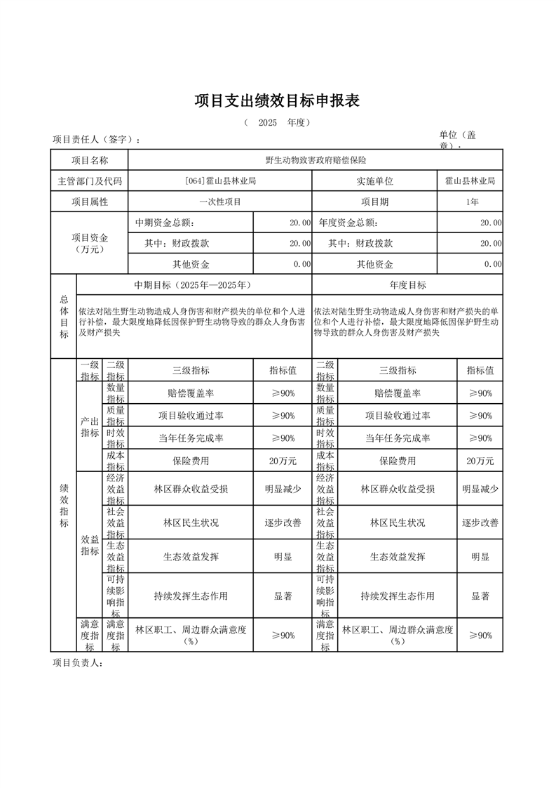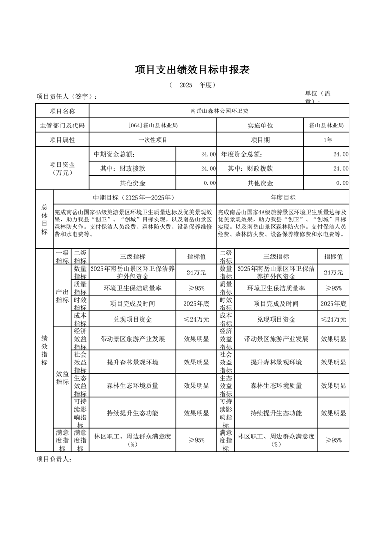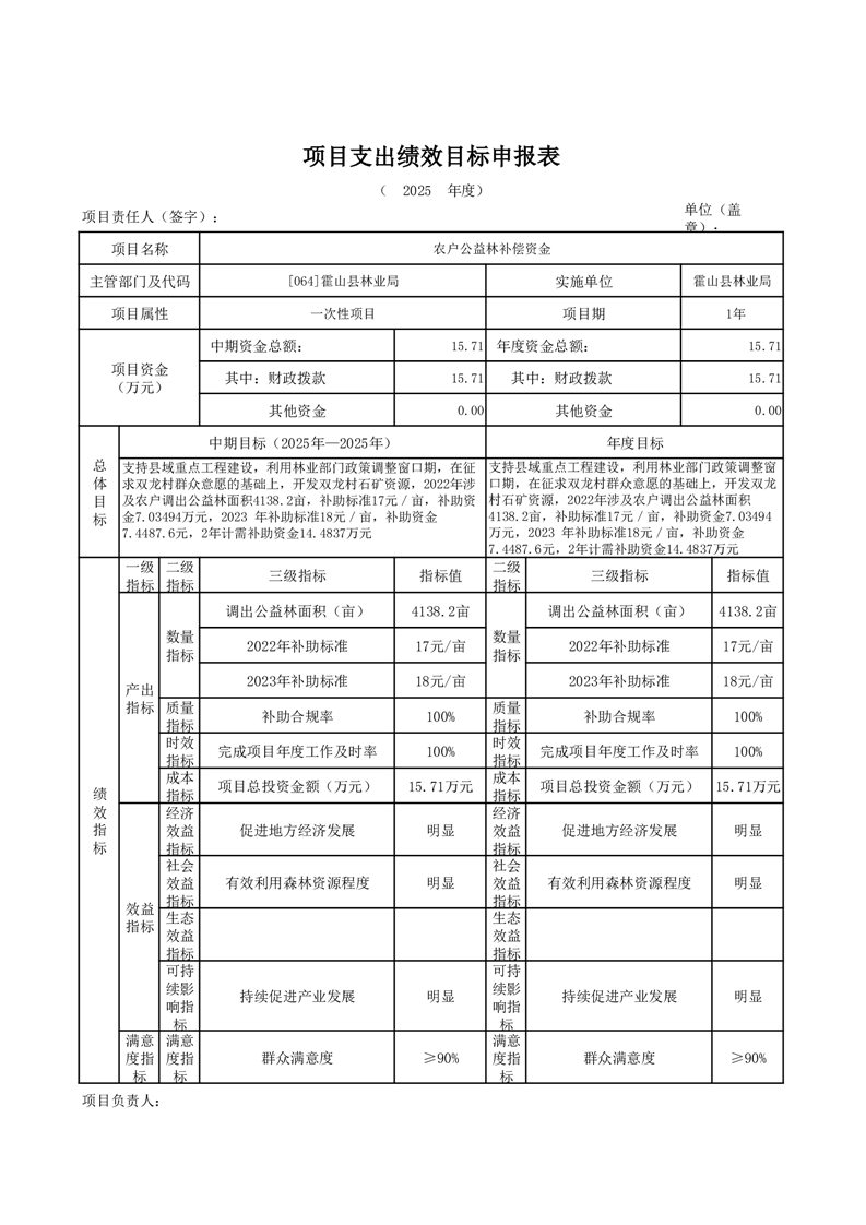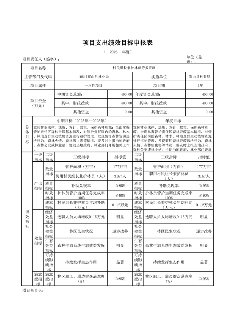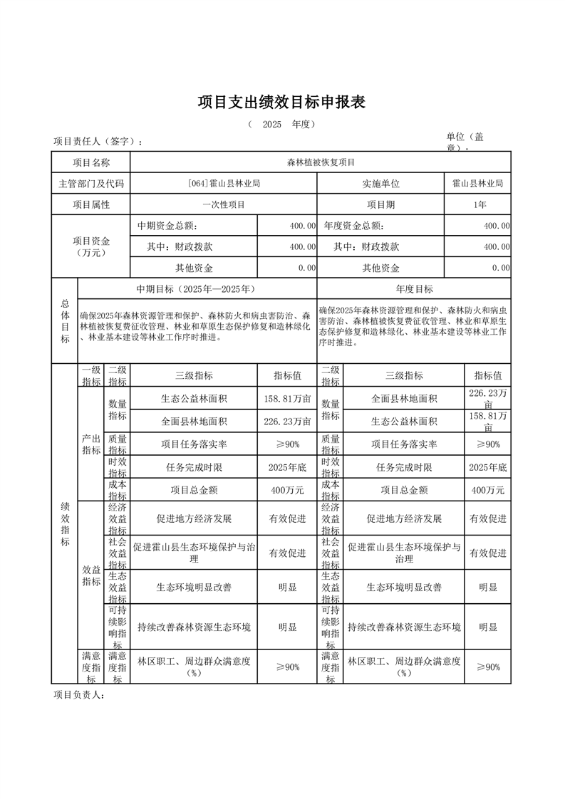 霍山县林业局2025年部门项目支出预算安排情况及绩效目标表