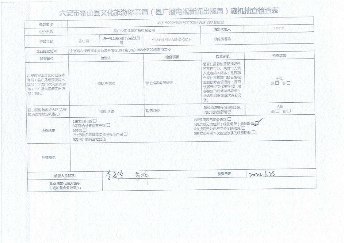 六安市2024年度对游艺娱乐场所的联合抽查—霍山悦阳儿童游乐有限公司