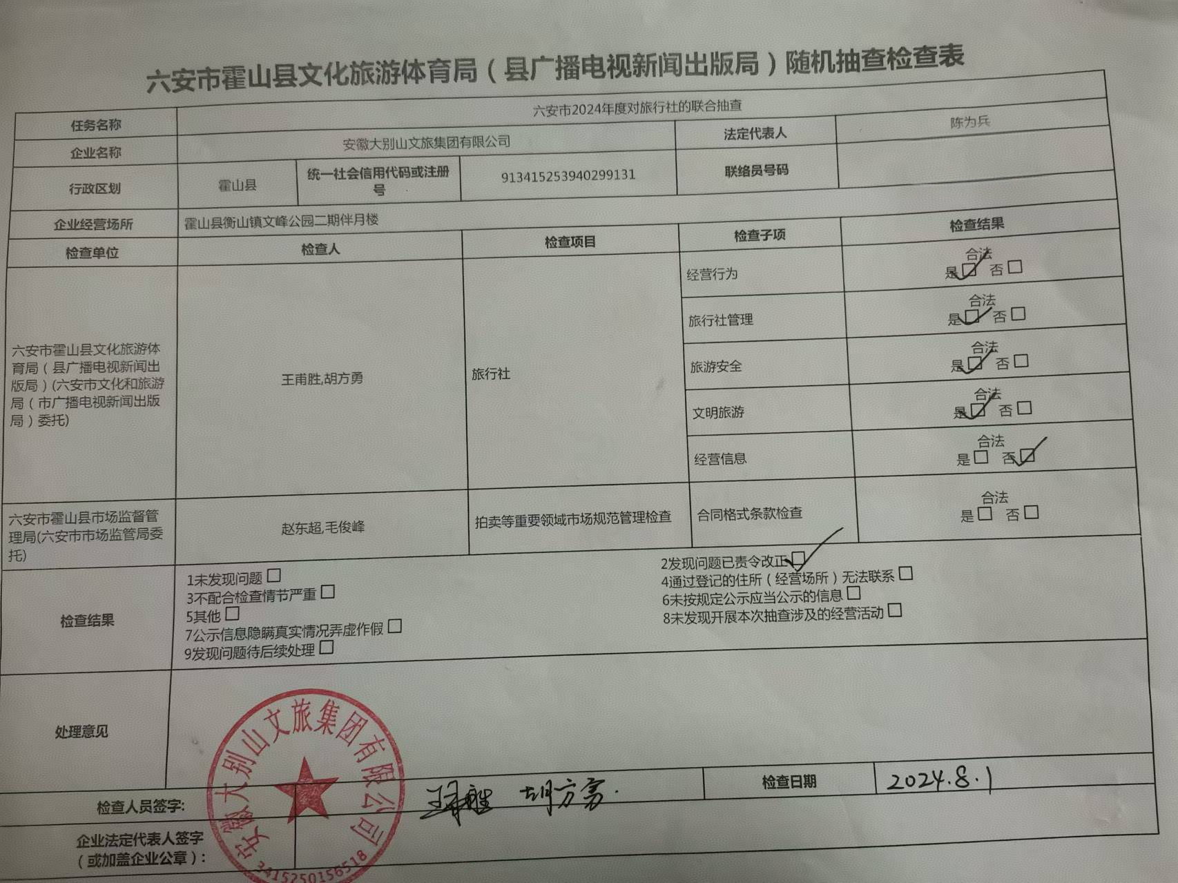 六安市2024年度对旅行社的联合抽查—安徽大别山文旅集团有限公司
