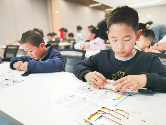 活动中,小读者们通过观看动画短片,了解电流流动路径、灯泡发光原理及电池能量转换等电路基础知识。“红色导线连接正极,黑色要找对负极伙伴!”志愿者用趣味比喻指导操作,“小小工程师”们仔细辨别线路、亲手安装开关、精准连接导线,完成手电筒组装。当第一束光亮起时,现场响起惊喜的欢呼声。拓展环节中,孩子们还创意改造手电筒,用彩色玻璃纸、手绘图案打造个性化光影作品。