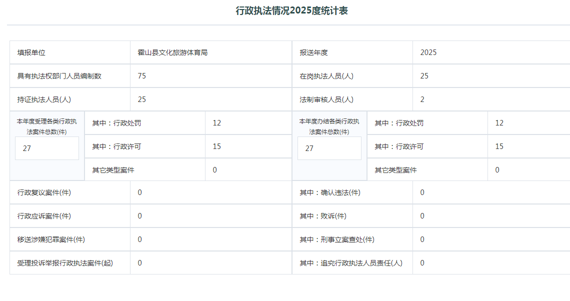 霍山县文化旅游体育局2025年度行政执法统计年报
