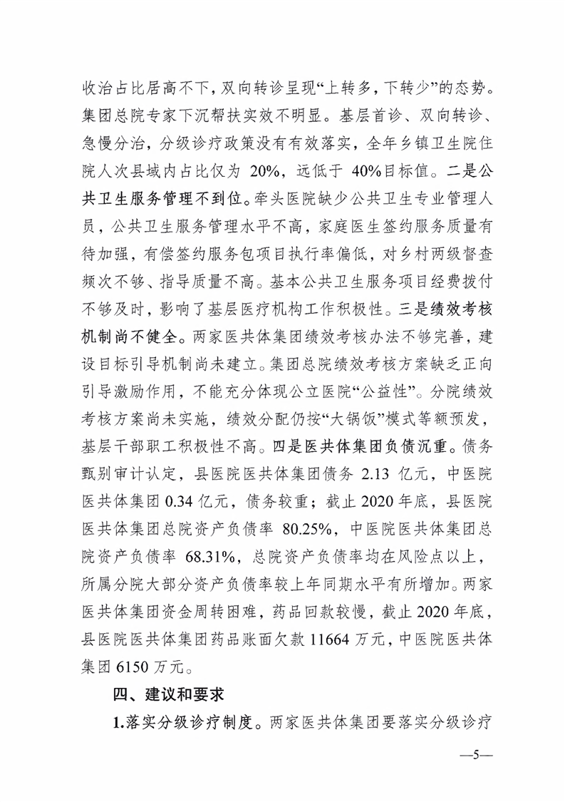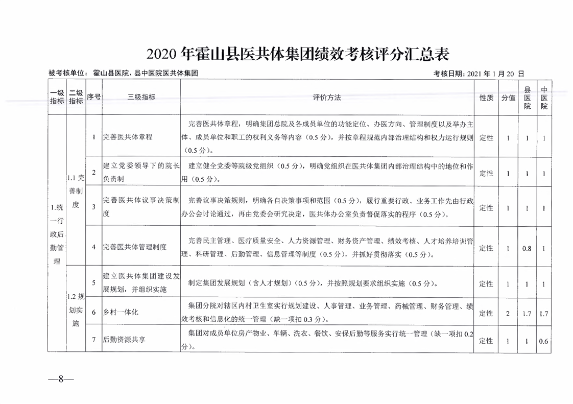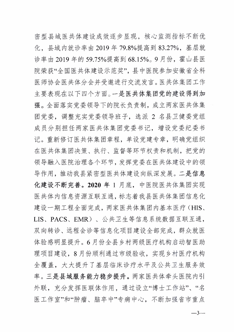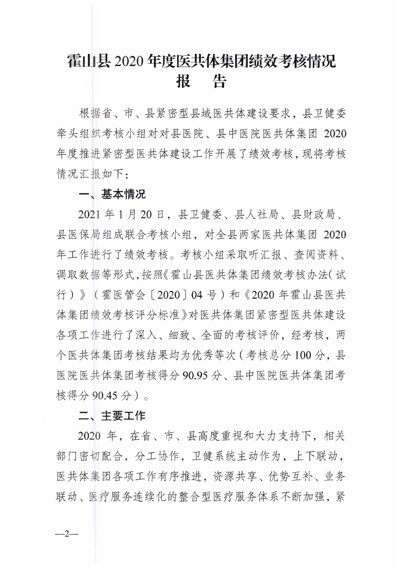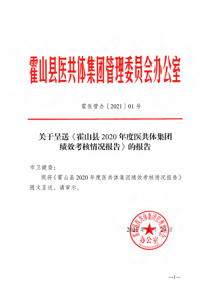 霍医管办[2021]01号 关于呈送《霍山县2020年医共体集团绩效考核情况报告》的报告