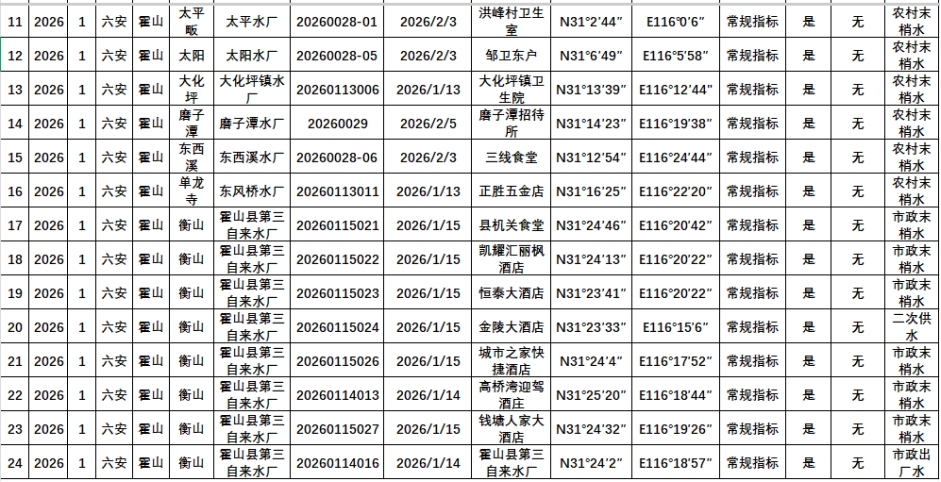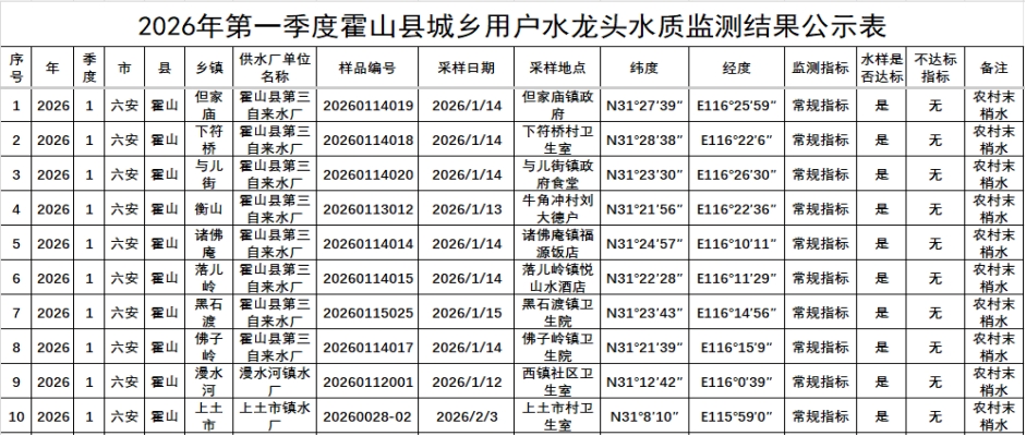 为贯彻落实《水污染防治法》和国务院《水污染防治行动计划》,根据《关于进一步加强全省饮用水水质监测和信息公开工作的通知》(皖卫传〔2019〕196号)要求,霍山县疾病预防控制中心按照《生活饮用水卫生标准》(GB5749-2022),于2026年1月份开展了第一季度霍山县城乡用户水龙头水质监测工作,现将水质监测信息公开,详见下表: