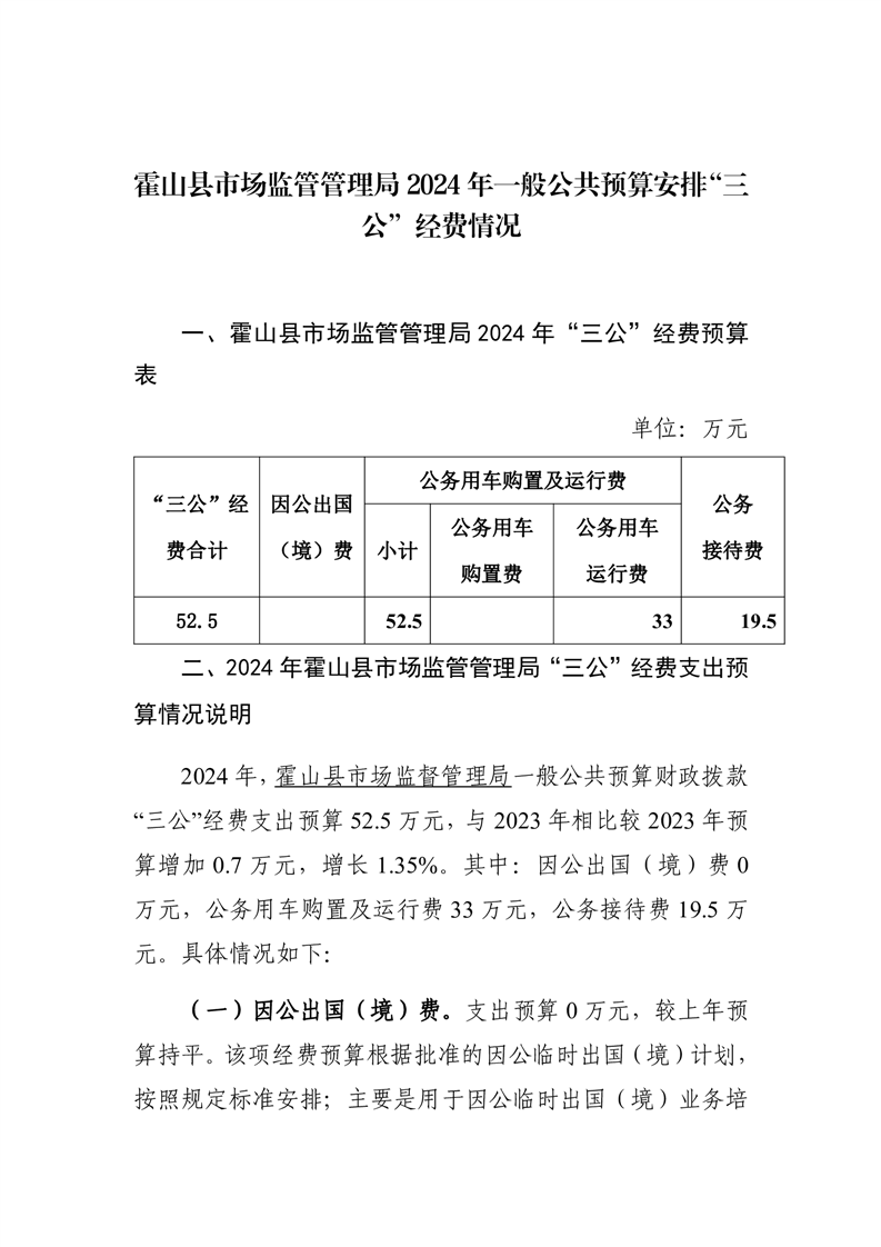 霍山县市场监督管理局2024年一般公共预算安排“三公”经费情况