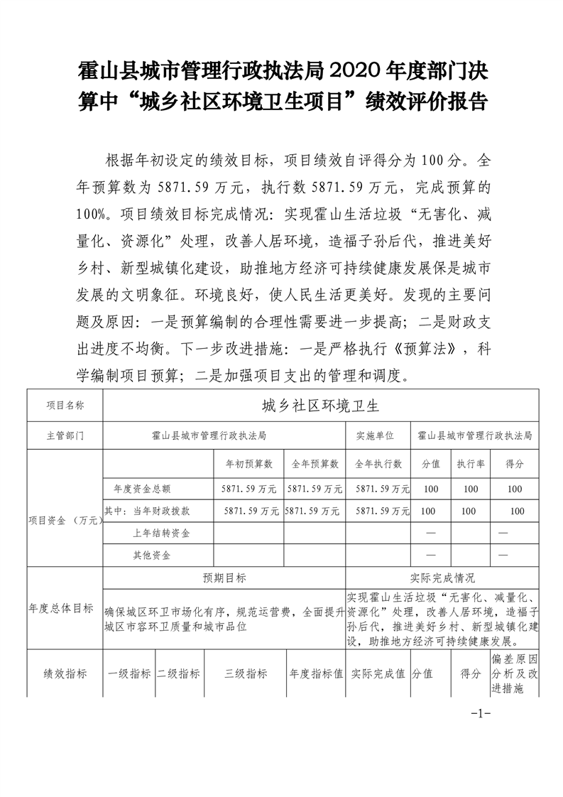 霍山县城市管理行政执法局2020年度部门决算中“城乡社区环境卫生项目”绩效评价报告