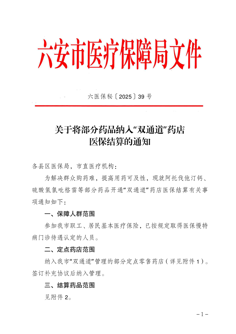 关于将部分药品纳入“双通道”药店医保结算的通知