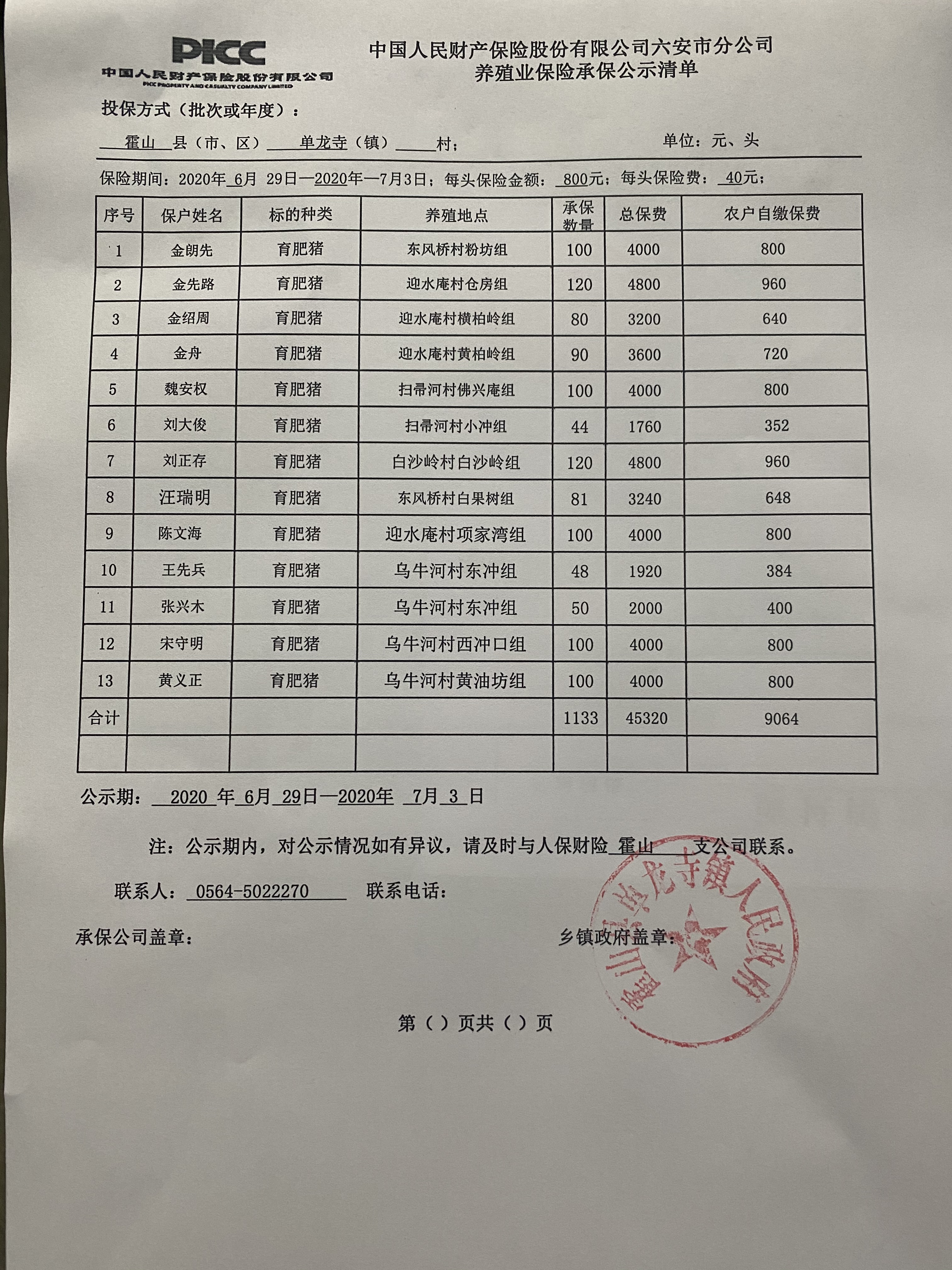 霍山县单龙寺镇2020年畜牧良种补贴资金分配清册(一)