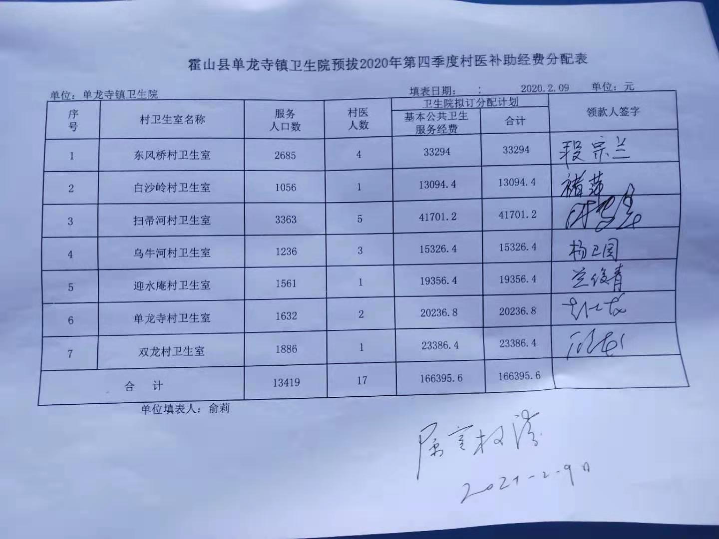 单龙寺镇2020年第四季度各村卫生室公共卫生服务体系建设补助资金清册