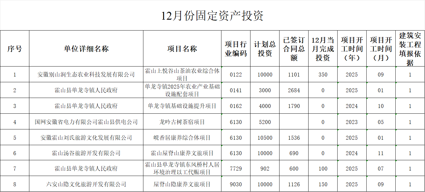 霍山县单龙寺镇2025年12月度统计信息及数据分析