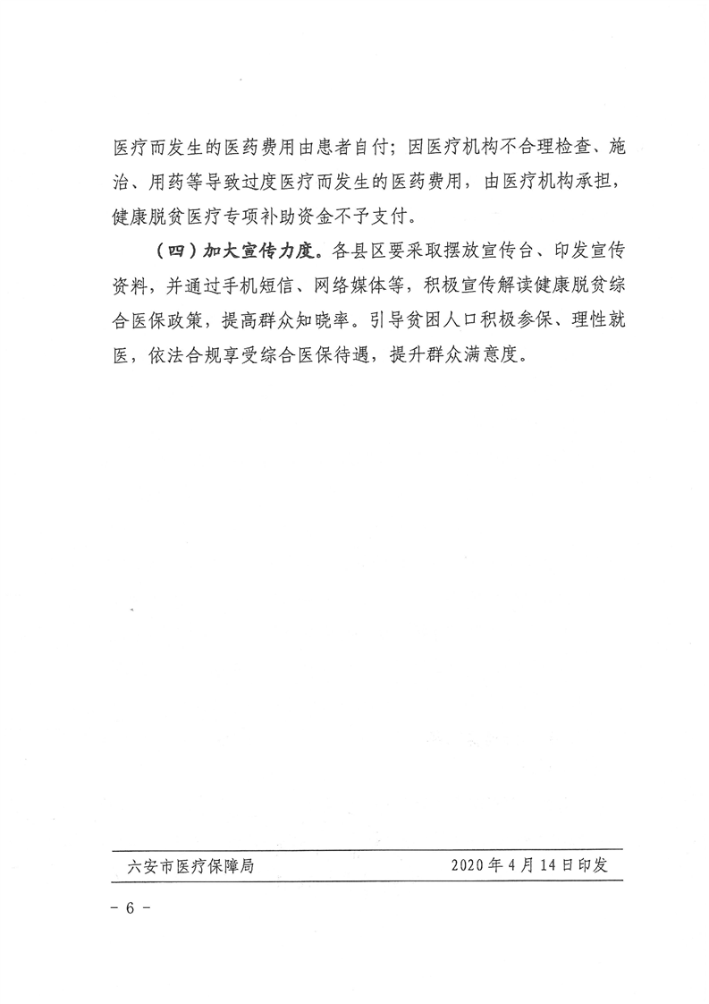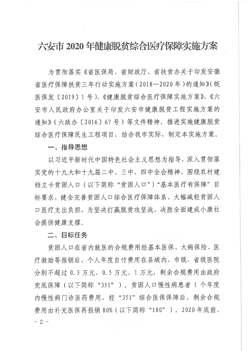 关于印发《六安市2020年健康脱贫综合医疗保障实施方案》的通知
