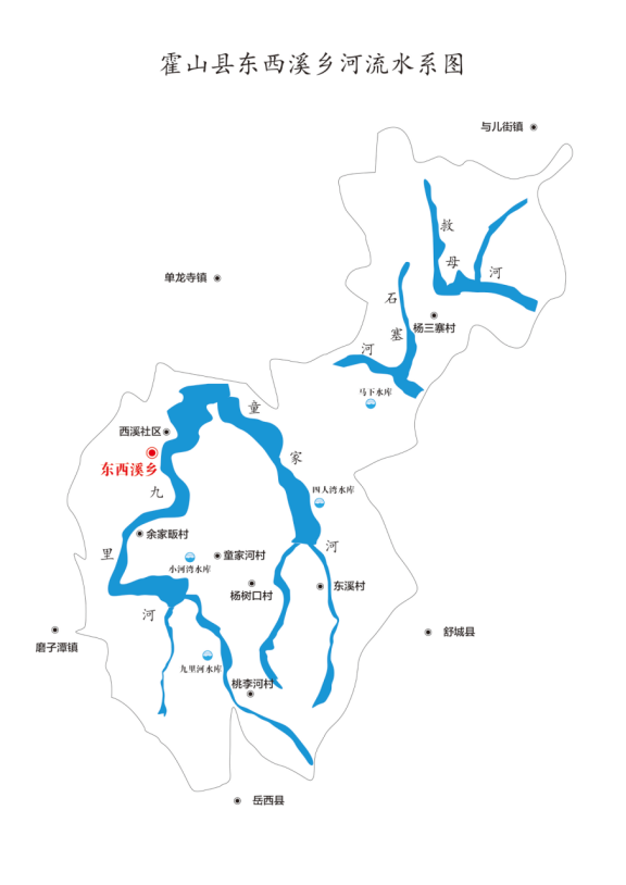 东西溪乡境内河道属淮河流域及长江流域。境内辖四条主要河流,分别为九里河干流,长度约15.0km,童家河长度约13.0km,石塞河长度约7.0km,救母河长度约7.0km。乡内有四座小(2)型水库,分别为四人湾水库、小河湾水库、马下水库、九里河水库。