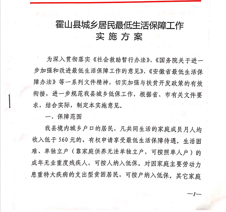 【政策标准】《霍山县城乡居民最低生活保障工作实施方案》