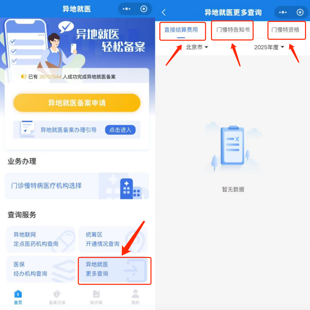 点击【异地就医更多查询】可查询“异地就医费用明细”、“门诊慢特病告知书”、“门诊慢特病资格”。
