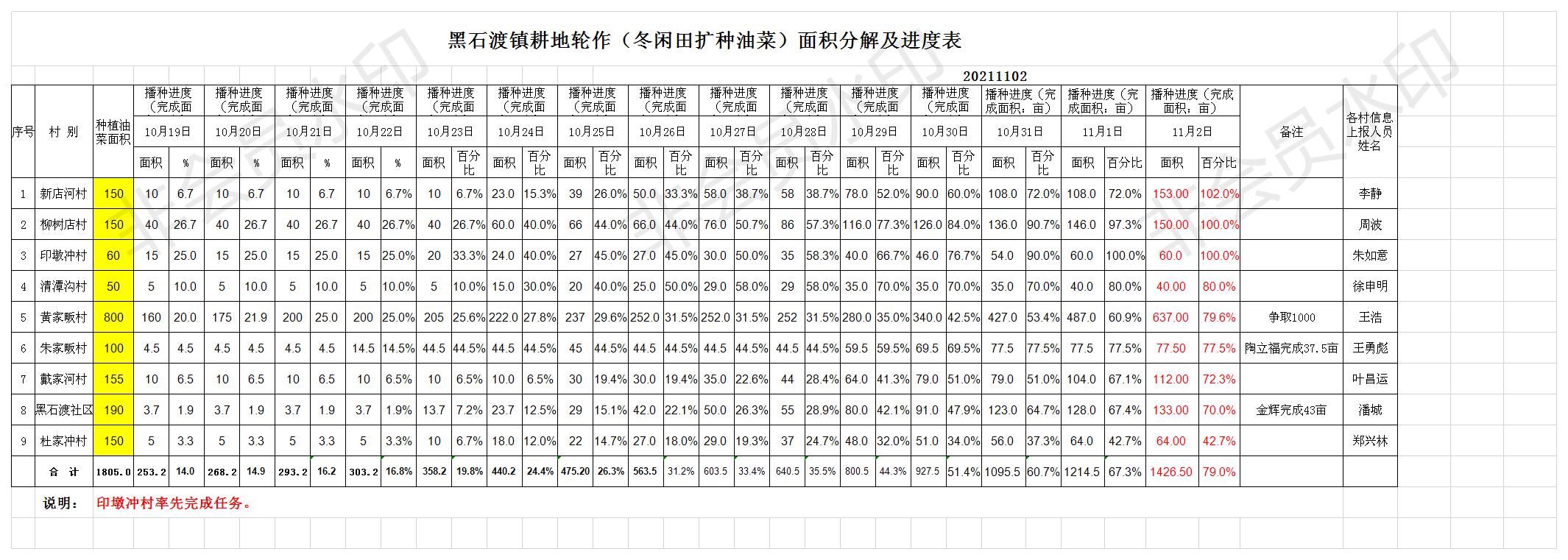 霍山县黑石渡镇2021年耕地轮作(冬闲田扩种油菜)面积分解及进度表