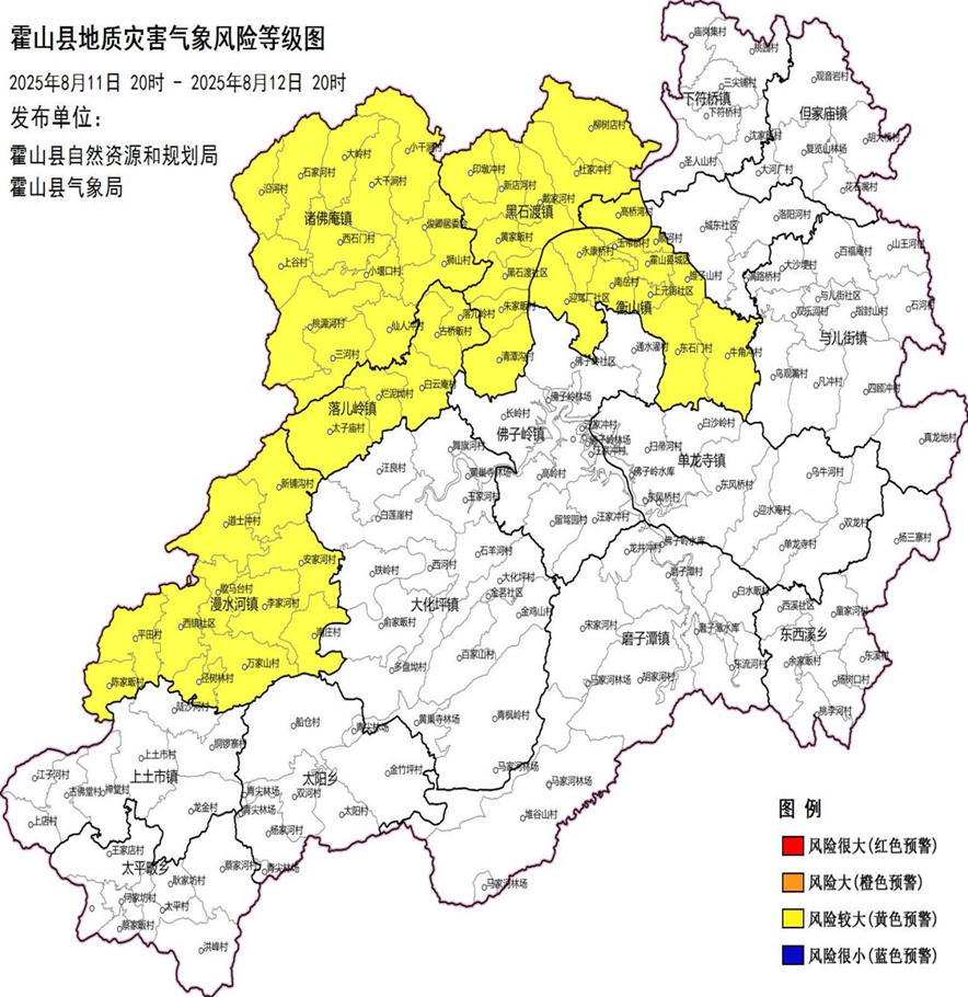 县自然资源和规划局、县气象局联合发布地质灾害气象风险预警:2025年8月11日20时至2025年8月12日20时,发生地质灾害的可能性较大(黄色)区域涉及:衡山镇:黑石渡镇:诸佛庵镇:落儿岭镇;漫水河镇;请严密防范,加强隐患监测和巡查,一旦发现灾情、险情,提前避险转移群众,并按规定速报。(电话:5022118,传真:5022897)