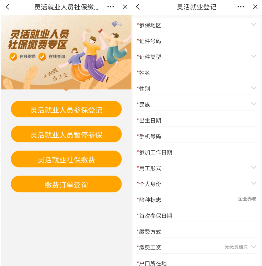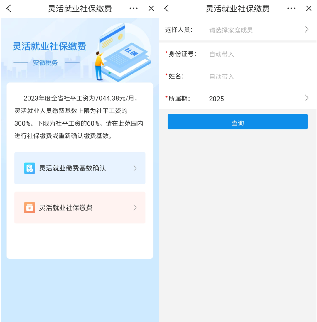 点击专区内的“灵活就业社保缴费”服务,选择家庭成员后点击页面下方“查询”按钮,获取用户参保信息,用户选择具体的险种信息,点击页面下方“缴费”按钮进行缴费即可。